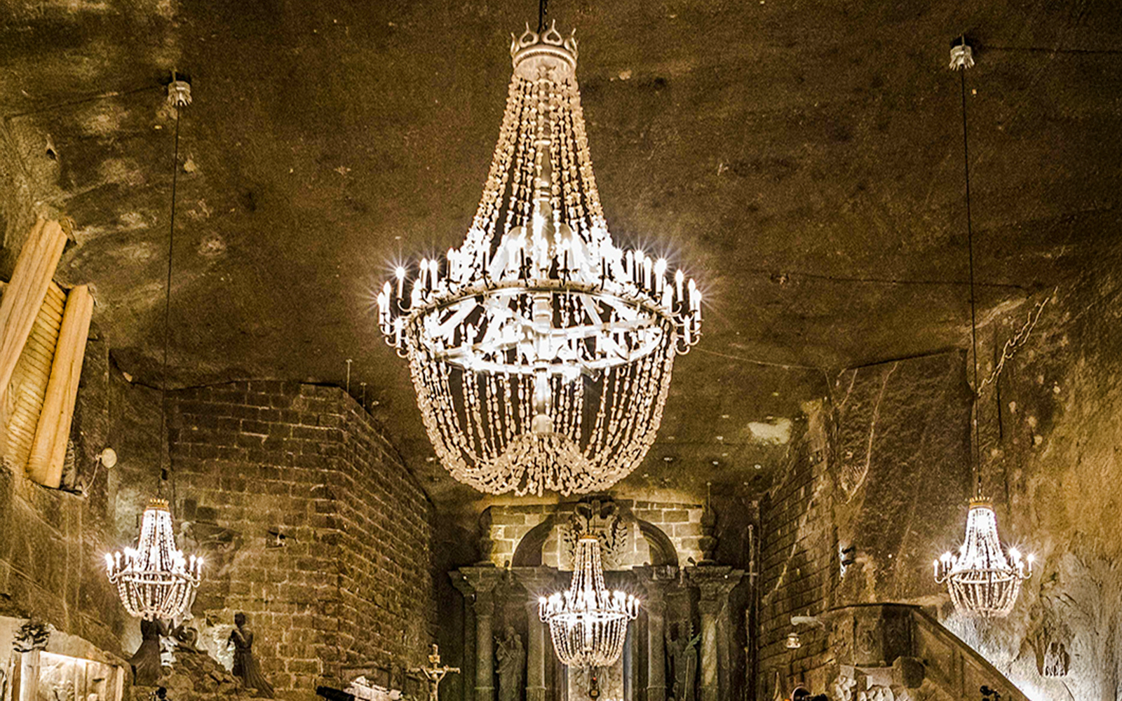 Highlights: Ein kunstvoll geschnitzter Salzaltar, Kronleuchter aus Salzkristallen, detaillierte biblische Reliefs und ganz aus Steinsalz gefertigte Statuen.